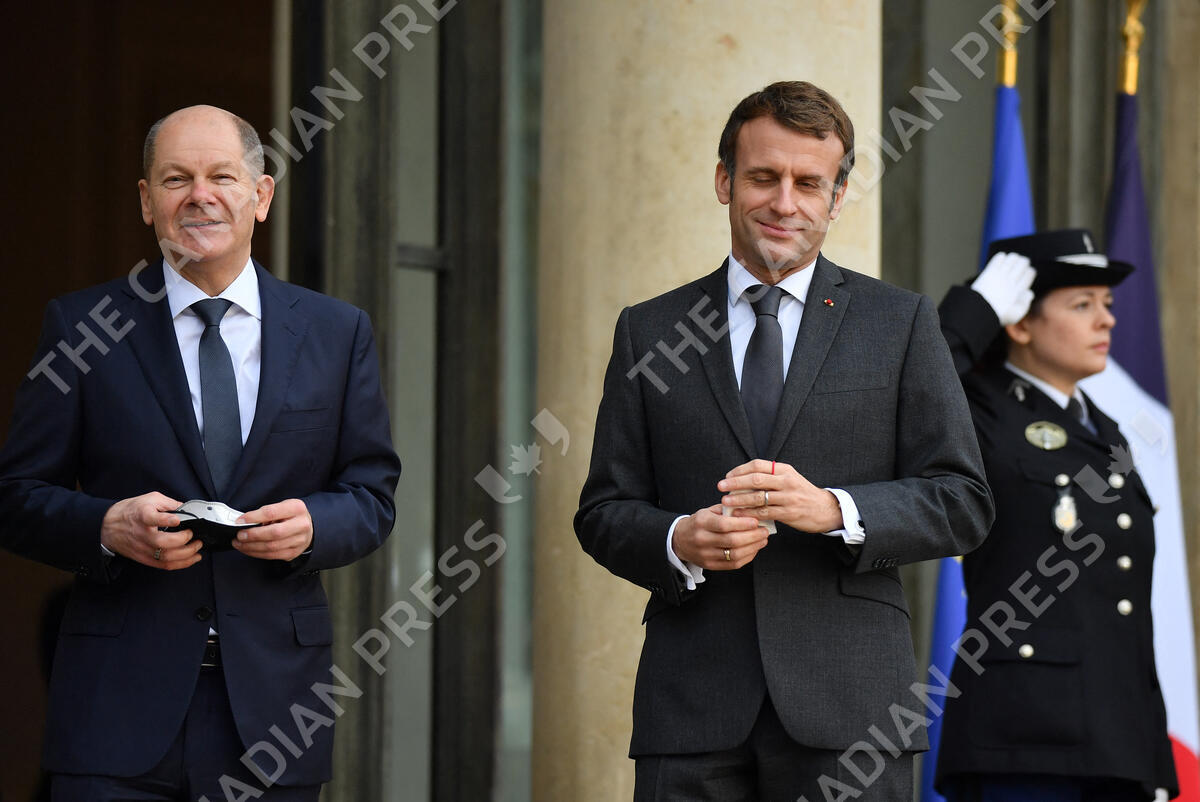 French President Emmanuel Macron greets German Chancellor Olaf Scholz ahead of their meeting at the Elysee presidential palace on December 10, 2021 in Paris, France. This is the first trip abroad of the German Chancellor since his election. Photo by Christian Liewig/ABACAPRESS.COM