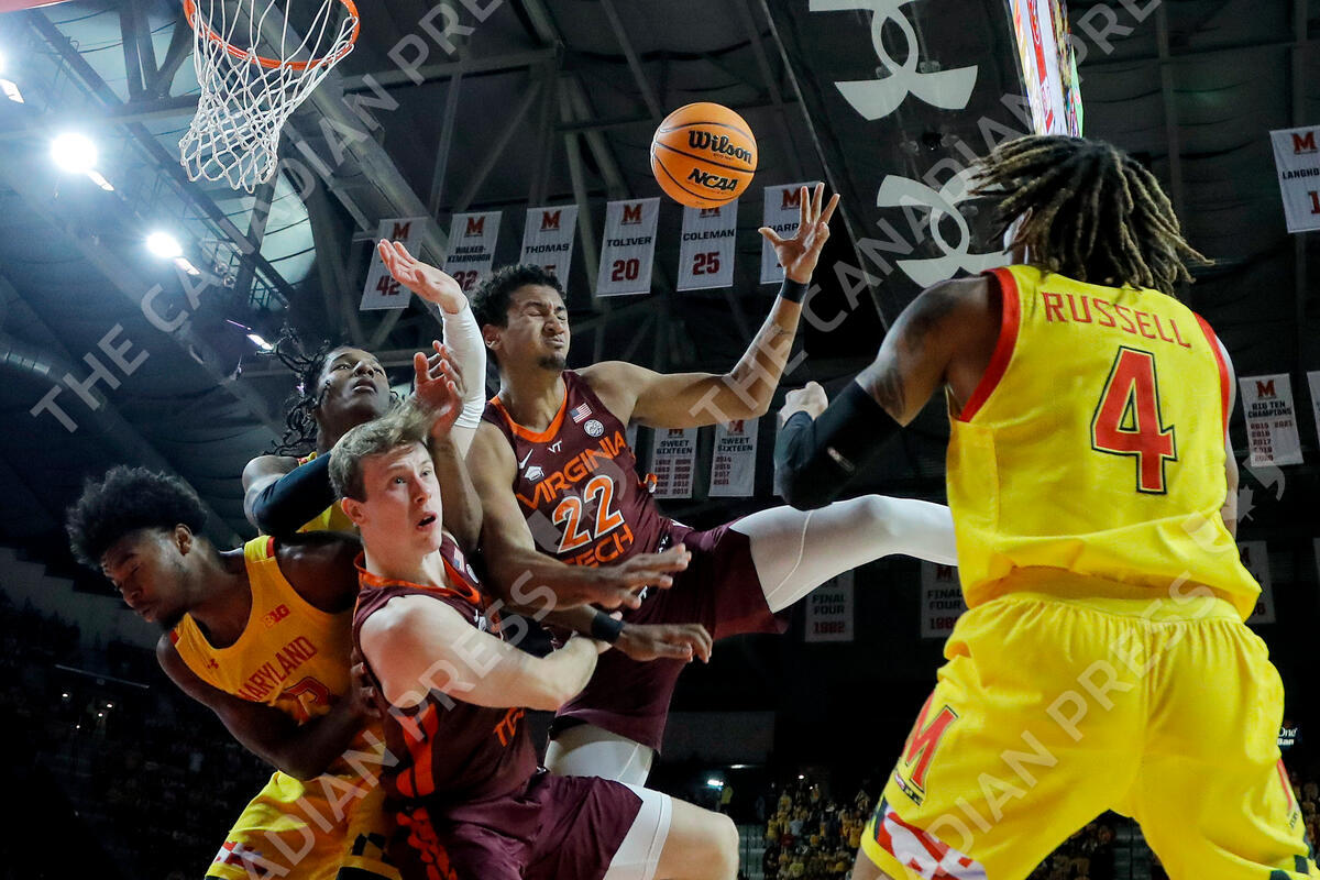 Virginia Tech forward Keve Aluma (22) and teammate Storm Murphy, center left, compete for a rebound with Maryland players, from left, Hakim Hart, Julian Reese and Fatts Russell (4) during the second half of an NCAA college basketball game, Wednesday, Dec. 1, 2021, in College Park, Md. Virginia Tech won 62-58. (AP Photo/Julio Cortez)