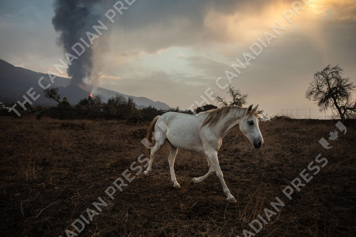 September 27, 2021, La Palma, Santa Cruz de Tenerife, Canary Islands, Spain: A horse on a farm in Tacande de Abajo, while the Cumbre Vieja volcano in La Palma expels lava and pyroclasts after hours of relative inactivity. (Credit Image: © Kike Rincon/Contacto via ZUMA Press)
