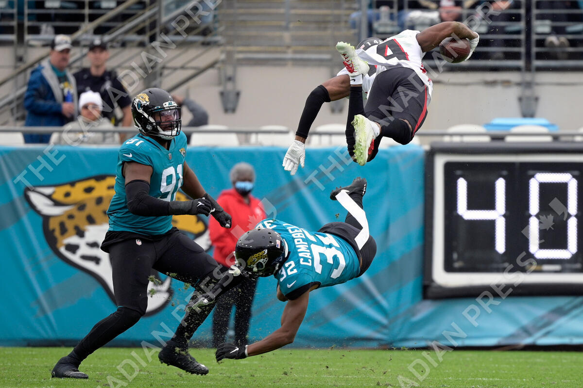 Atlanta Falcons wide receiver Russell Gage, top right, leaps over Jacksonville Jaguars cornerback Tyson Campbell (32) and defensive end Dawuane Smoot, left, after a reception during the first half of an NFL football game, Sunday, Nov. 28, 2021, in Jacksonville, Fla. (AP Photo/Phelan M. Ebenhack)
