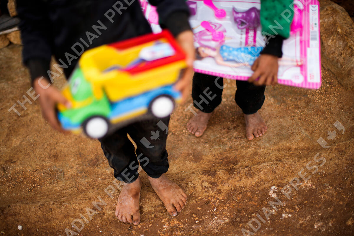 Syrian children hold donated toys in a refugee camp for displaced people supported by the Turkish Red Crescent in Sarmada district, north of Idlib city, Syria, Thursday, Nov. 25, 2021. (AP Photo/Francisco Seco)