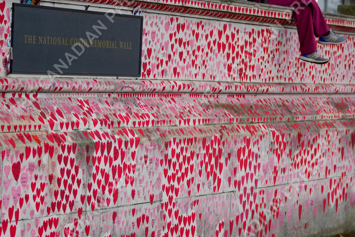 FILE - A member of staff of the nearby St Thomas' Hospital rests on the National Covid Memorial Wall in London, Tuesday Nov. 9, 2021. The British government is due to decide about mandatory vaccination for NHS staff.(AP Photo/Frank Augstein, File)