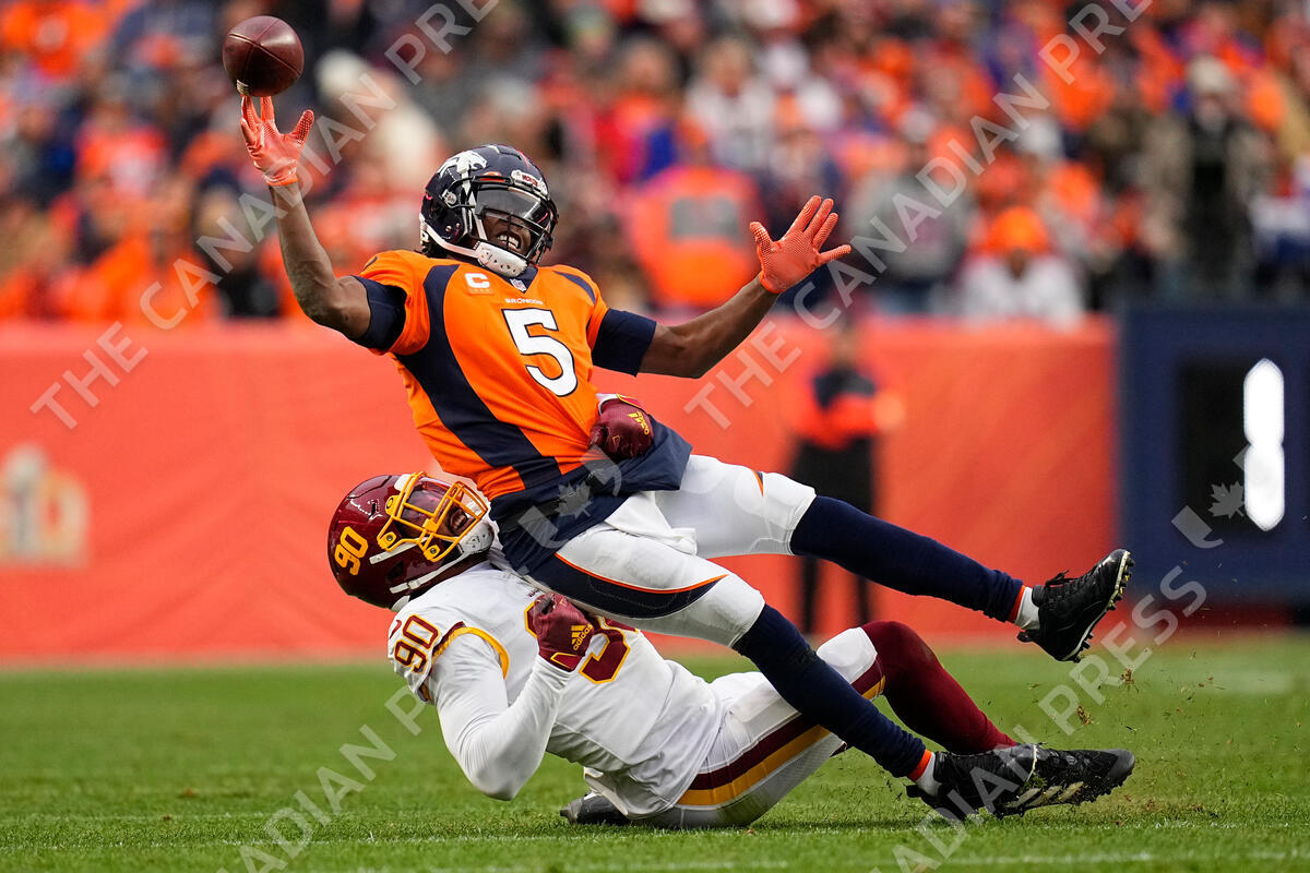 Denver Broncos quarterback Teddy Bridgewater (5) gets the ball away as Washington Football Team defensive end Montez Sweat (90) pulls him down during the second half of an NFL football game, Sunday, Oct. 31, 2021, in Denver. (AP Photo/Jack Dempsey)