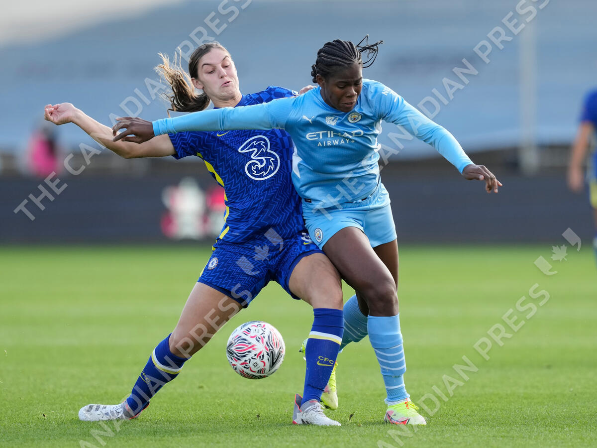 Manchester, England, 31st October 2021. Aniek Nouwen of Chelsea tackles Khadija Shaw of Manchester City during the The Women's FA Cup match at the Academy Stadium, Manchester. Picture credit should read: Andrew Yates / Sportimage via PA Images