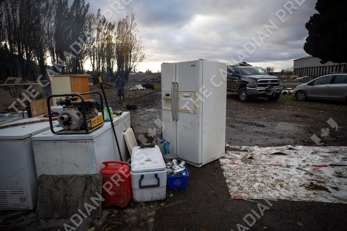 A fridge and other items a farm manager salvaged from inside the lower floor of a house the family rents on a farm that flooded sit outside, in Abbotsford, B.C., Tuesday, Nov. 23, 2021. THE CANADIAN PRESS/Darryl Dyck