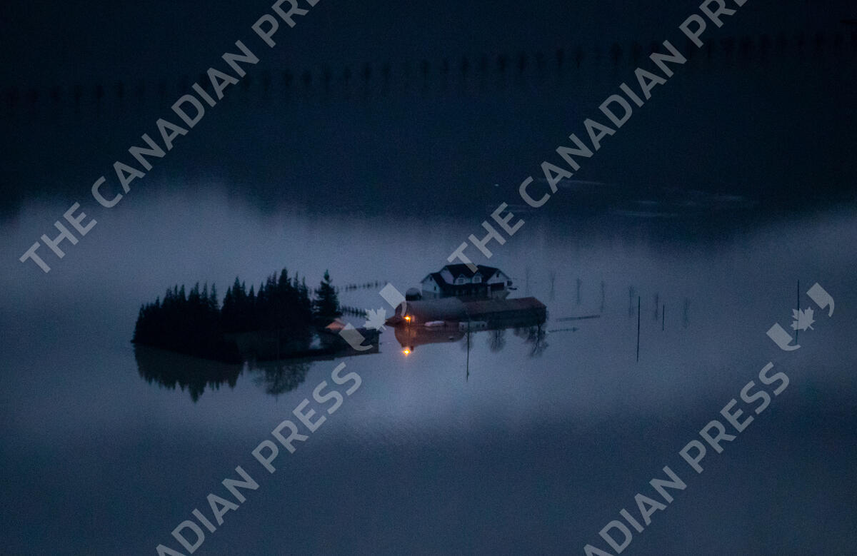 A house and a barn are surrounded by floodwaters on a farm at dusk as seen in an aerial view from a Canadian Forces reconnaissance flight in Abbotsford, B.C., on Monday, November 22, 2021. THE CANADIAN PRESS/Darryl Dyck