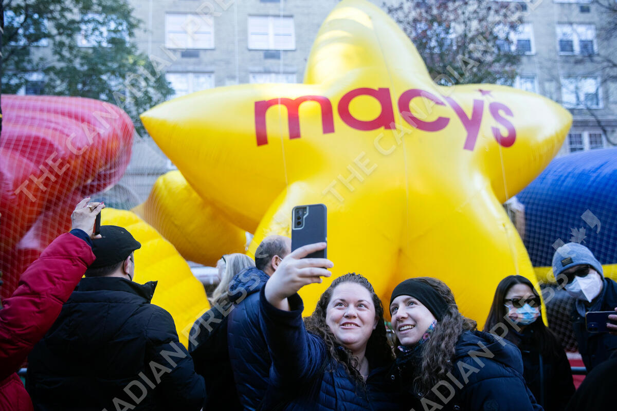 Spectators take a selfie at the yellow Macy's star balloon during Macy's 95th Annual Thanksgiving Day Parade's "Inflation Eve," Wednesday, Nov. 24, 2021, in New York. (AP Photo/Jeenah Moon)