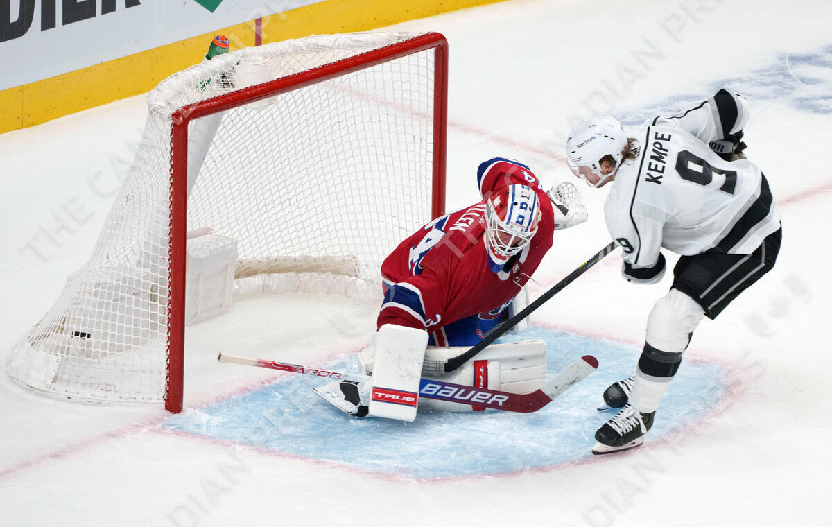 Los Angeles Kings' Adrian Kempe scores past Montreal Canadiens goaltender Jake Allen during overtime NHL hockey action in Montreal on Tuesday, November 9, 2021. THE CANADIAN PRESS/Paul Chiasson