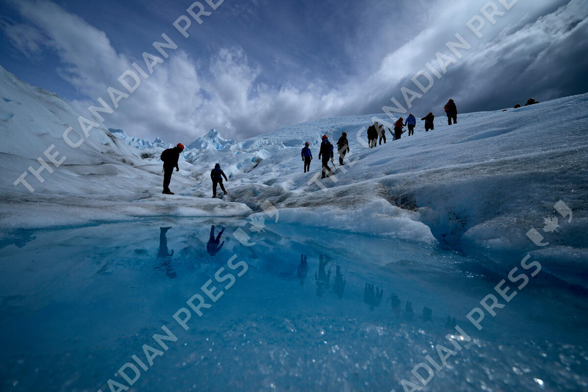 Tourists walk on the Perito Moreno Glacier at Los Glaciares National Park, near El Calafate, Argentina, Tuesday, Nov. 2, 2021. World leaders are gathered in Scotland at a United Nations climate summit, known as COP26, to push nations to ratchet up their efforts to curb climate change. Experts say the amount of energy unleashed by planetary warming could melt much of the planet's ice, raise global sea levels and increase extreme weather events. (AP Photo/Natacha Pisarenko)
