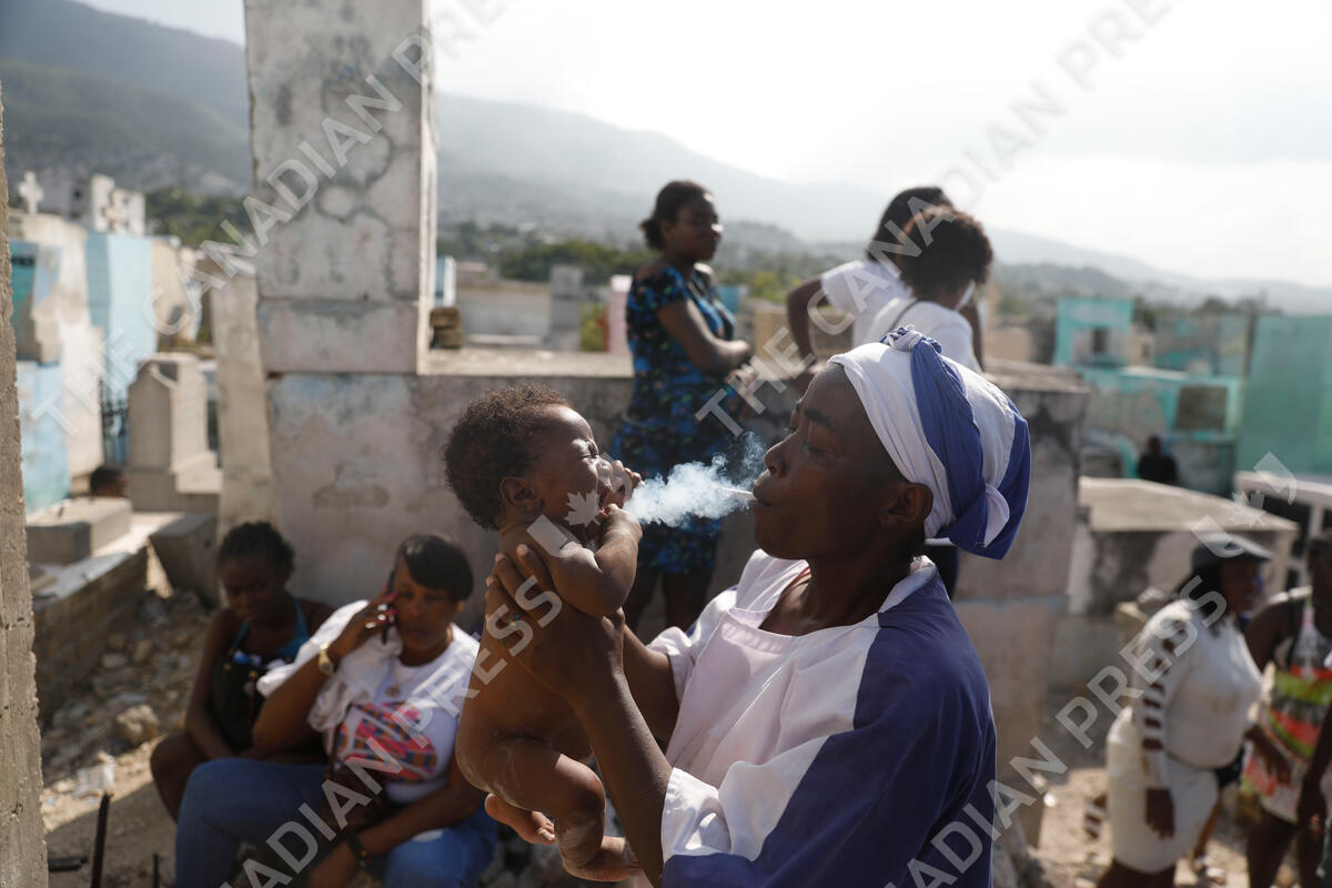 A Vodou priestess claiming to be possessed by a Gede spirit treats a sick baby during a ceremony honoring the Haitian Vodou spirit of Baron Samedi and Gede at the National Cemetery in Port-au-Prince, Haiti, Monday. Nov 1, 2021. (AP Photo/Odelyn Joseph)