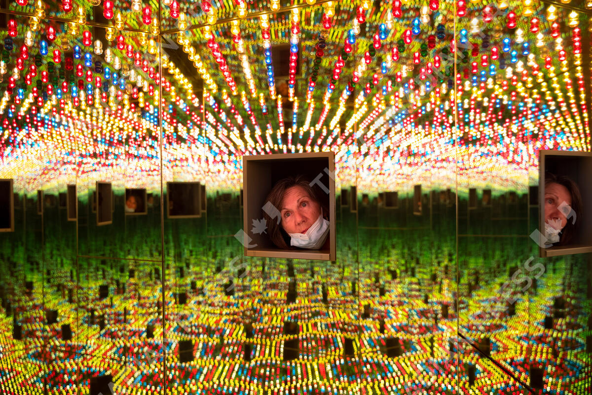 A woman looks at the art work, "The Infinity Room," by Yayoi Kusama, part of a retrospective exhibition in the Tel Aviv Museum of Art, Israel, Monday, Nov. 15, 2021. (AP Photo/Oded Balilty)