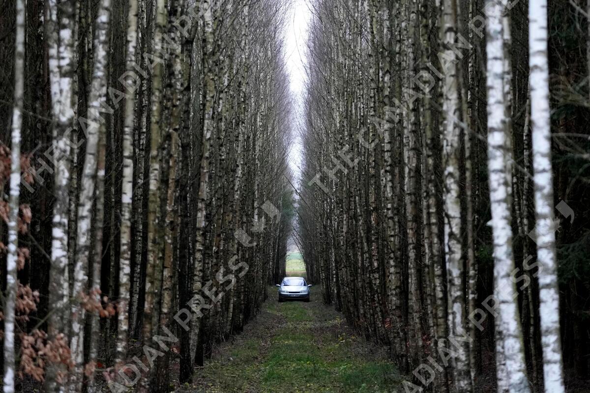 A view of a car parked between birch trees in a forest near Lipsk, Poland, Monday, Nov. 15, 2021. (AP Photo/Matthias Schrader)
