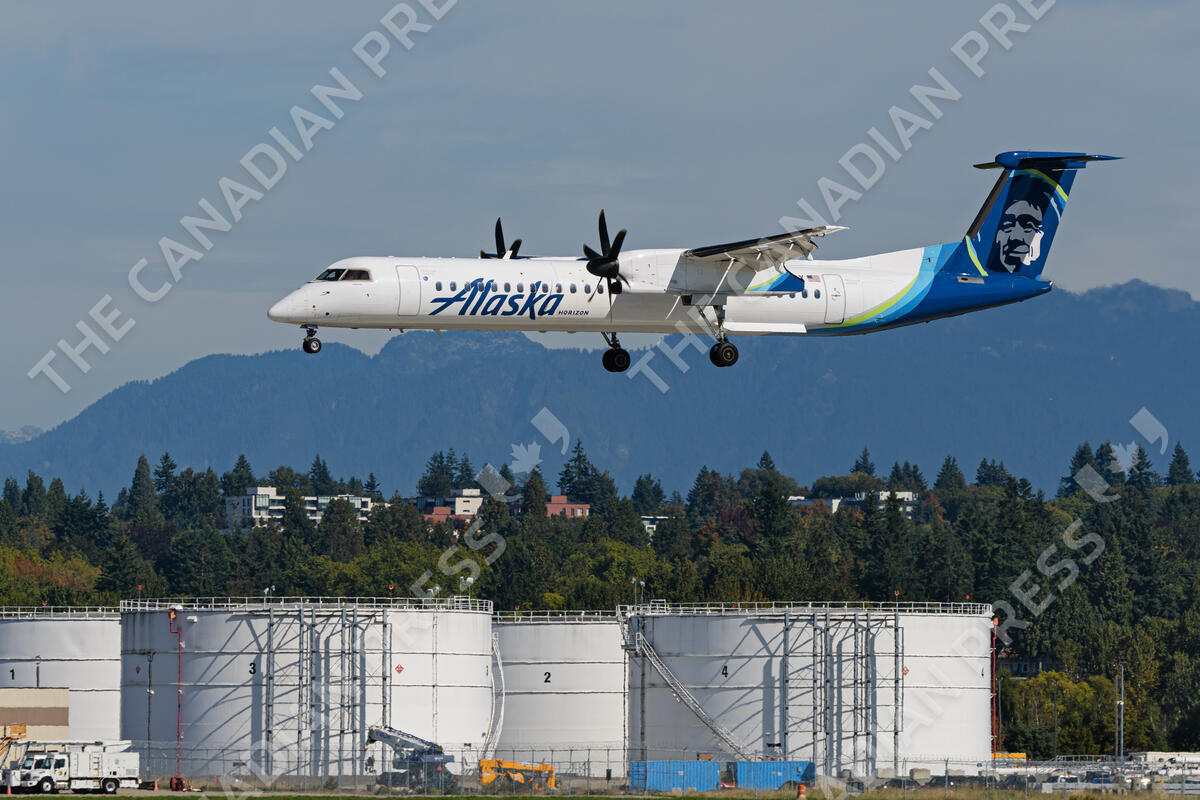 An Alaska Horizon DeHavilland Dash 8-400 twin engine turboprop regional airliner lands at Vancouver International Airport, Richmond, B.C. on Friday, September 24, 2021. THE CANADIAN PRESS IMAGES/Bayne Stanley