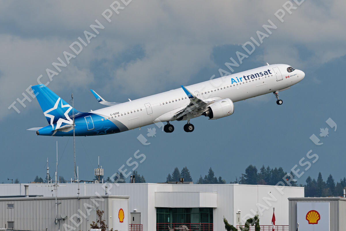 An Air Transat Airbus A321neo jet (C-GOIM) takes off from Vancouver International Airport, Richmond, B.C. on Thursday, October 7, 2021. THE CANADIAN PRESS IMAGES/Bayne Stanley