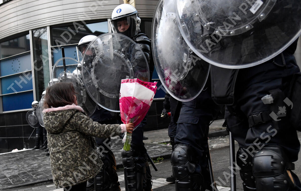 A girl gives flowers to riot police officers during a protest against coronavirus measures in Brussels, Belgium, Sunday, Dec. 5, 2021. Hundreds of people marched through central Brussels on Sunday to protest tightened COVID-19 restrictions imposed by the Belgian government to counter the latest spike in coronavirus cases. (AP Photo/Geert Vanden Wijngaert)