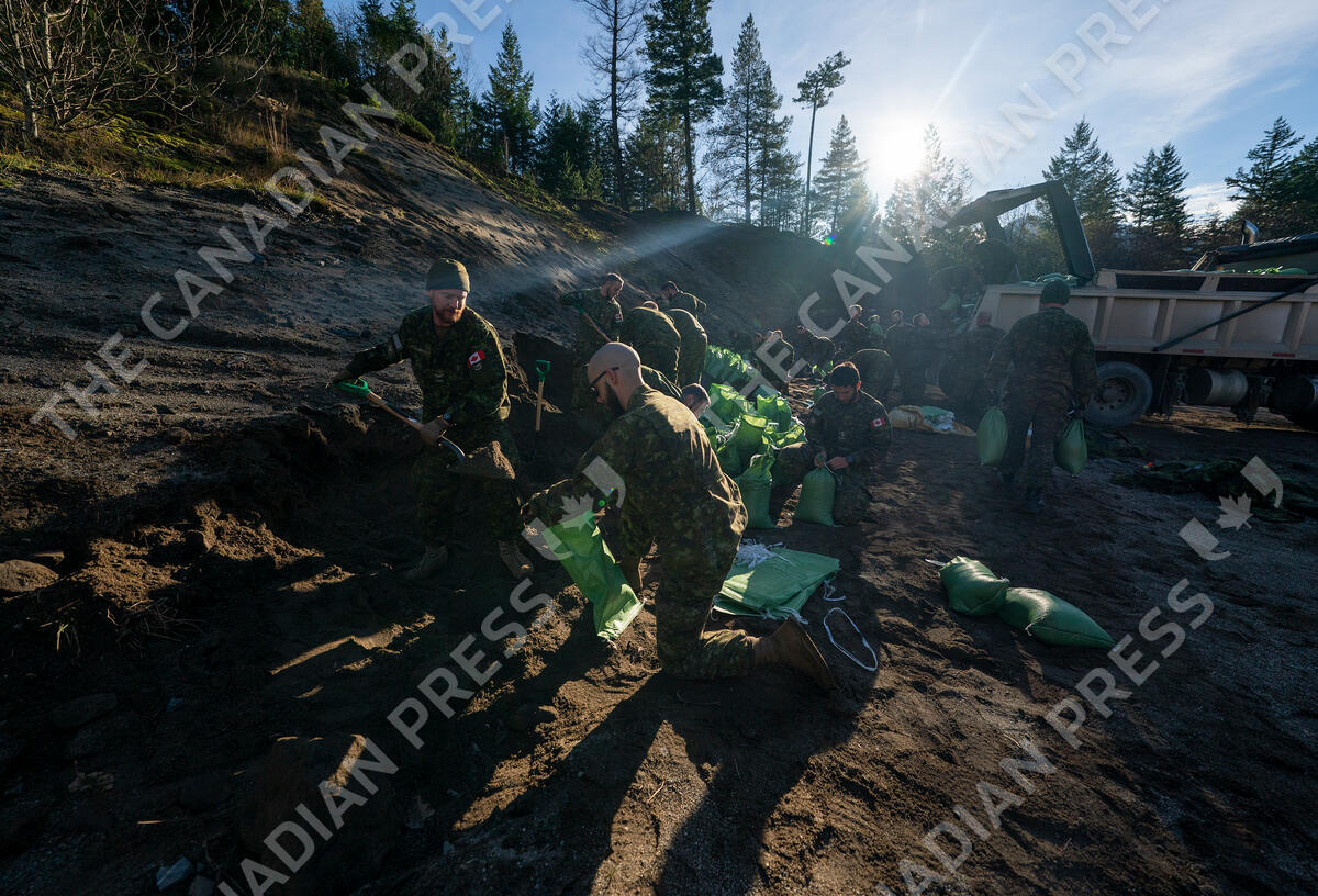 Members of the Canadian Forces fill sandbags in the Chawathil First Nation near Hope, B.C., Sunday, November 21, 2021. THE CANADIAN PRESS/Jonathan Hayward