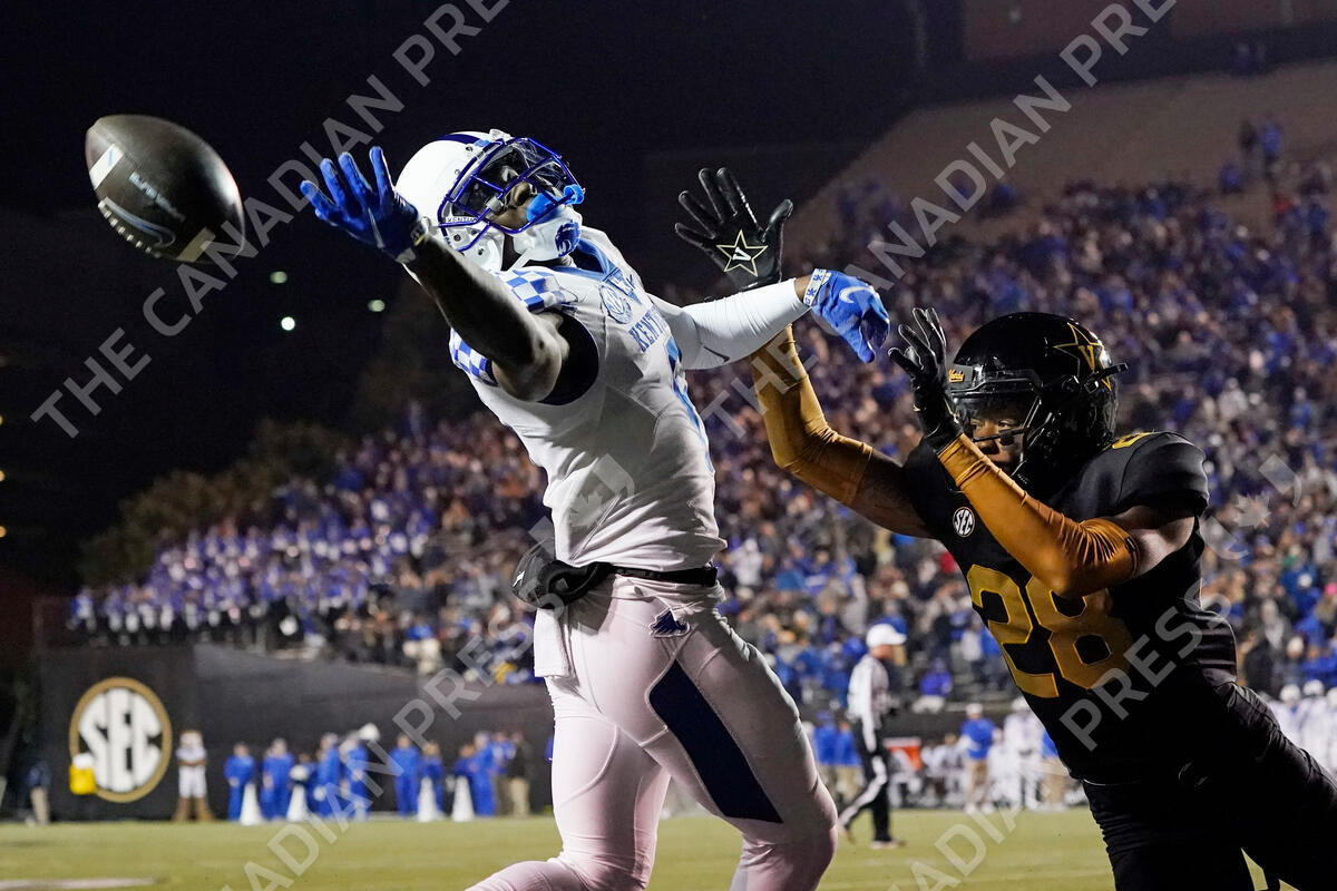 Kentucky wide receiver Josh Ali, left, reaches for a pass but can't hang onto it as he is defended by Vanderbilt cornerback Allan George (28) in the first half of an NCAA college football game Saturday, Nov. 13, 2021, in Nashville, Tenn. (AP Photo/Mark Humphrey)