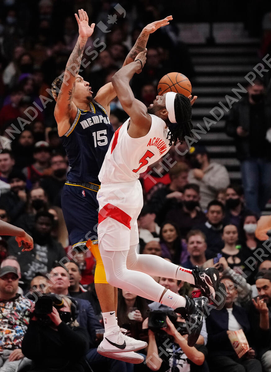 Toronto Raptors forward Precious Achiuwa (5) drives as Memphis Grizzlies forward Brandon Clarke (15) defends during first half NBA basketball action in Toronto on Tuesday, November 30, 2021.THE CANADIAN PRESS/Nathan Denette