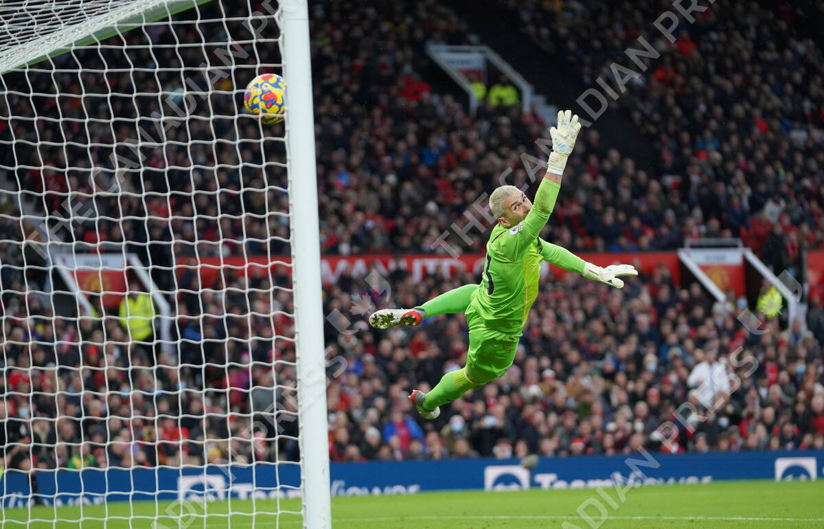 Crystal Palace's goalkeeper Vicente Guaita in action during the English Premier League soccer match between Manchester United and Crystal Palace at Old Trafford stadium in Manchester, England, Sunday, Dec. 5, 2021. (AP Photo/Jon Super)