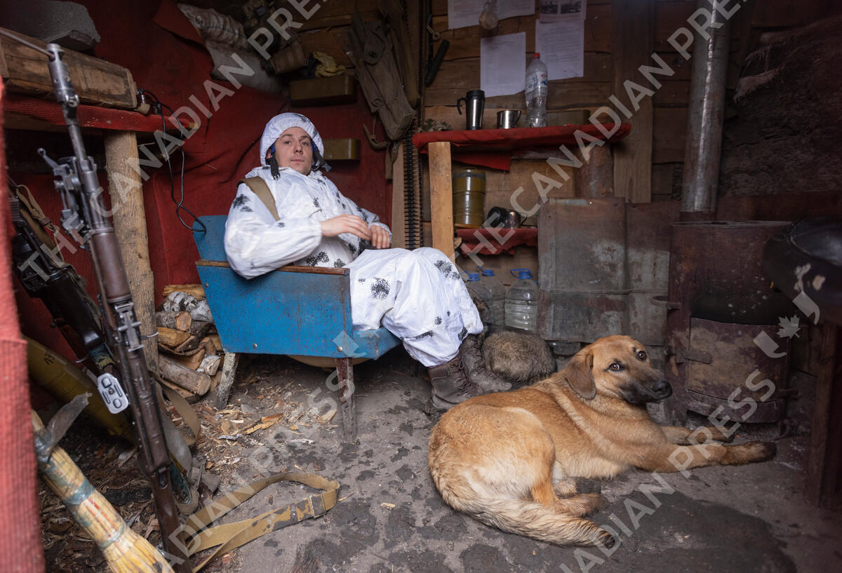 A Ukrainian soldier take a rest near a fighting position on the line of separation from pro-Russian rebels near Katerinivka, Donetsk region, Ukraine, Tuesday, Dec 7, 2021. Ukrainian authorities on Tuesday charged that Russia is sending tanks and snipers to the line of contact in war-torn eastern Ukraine to "provoke return fire," an accusation that comes amid fears that a Russian troop buildup near the Ukrainian border might indicate plans for an invasion. (AP Photo/Andriy Dubchak)