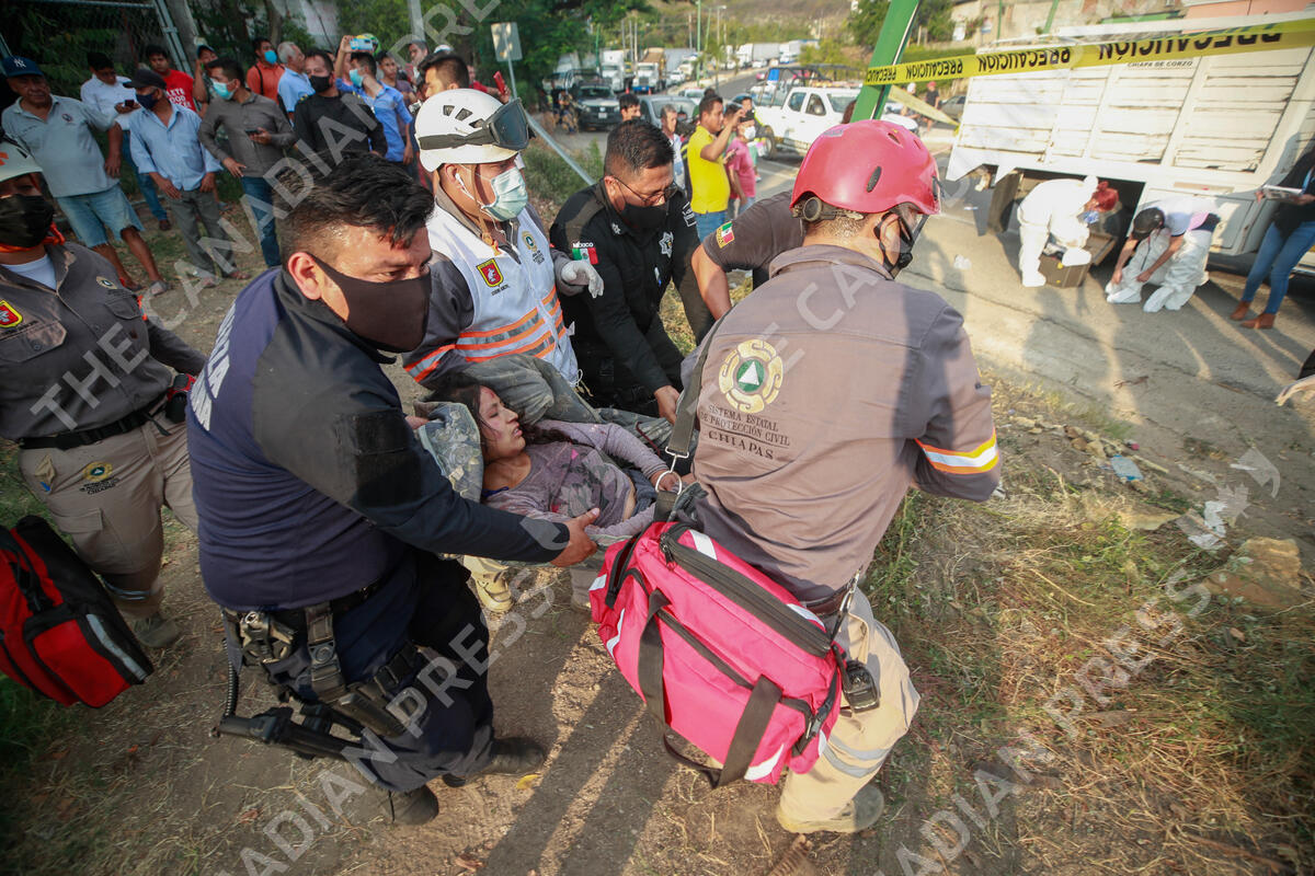An injured migrant woman is moved by rescue personnel from the site of an accident near Tuxtla Gutierrez, Chiapas state, Mexico, Thursday, Dec. 9, 2021. Mexican authorities say at least 49 people were killed and dozens more injured when the truck carrying the migrants rolled over on the highway in southern Mexico. (AP Photo)