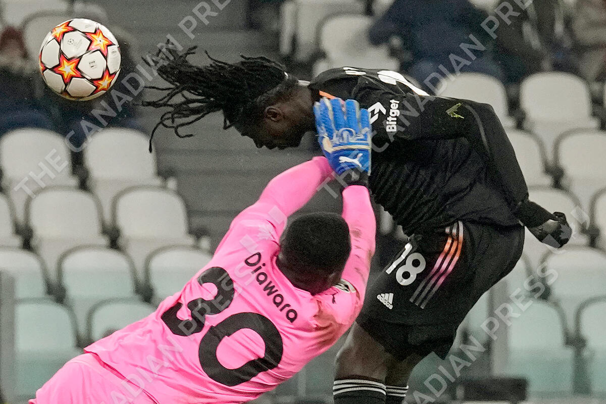 Juventus' Moise Kean, right, scores his side's opening goal during the Champions League group H soccer match between Juventus and Malmo at the Allianz stadium in Turin, Italy, Wednesday, Dec. 8, 2021. (AP Photo/Antonio Calanni)