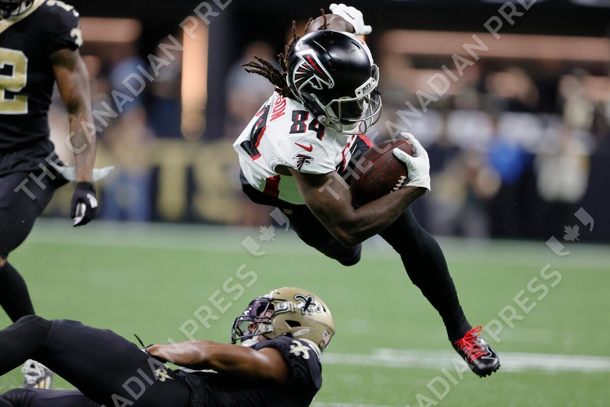 Atlanta Falcons running back Cordarrelle Patterson (84) leaps over New Orleans Saints free safety Marcus Williams (43) during the first half of an NFL football game, Sunday, Nov. 7, 2021, in New Orleans. (AP Photo/Butch Dill)