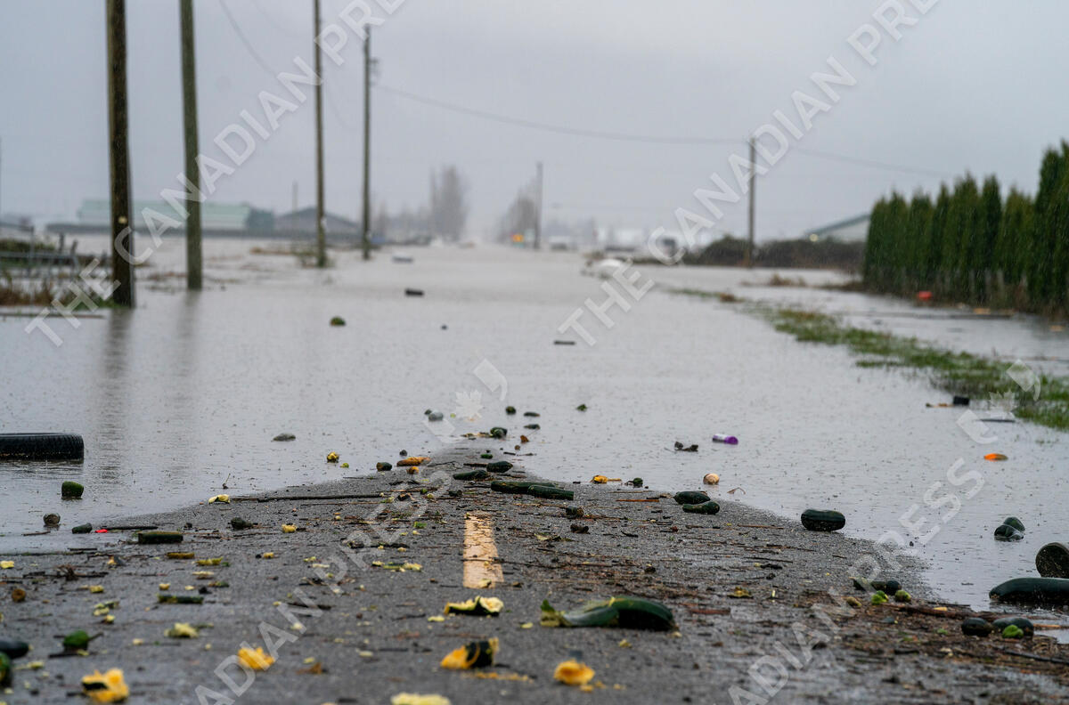 Debris is pictured along a flooded road in Abbotsford, B.C., Thursday, November 25, 2021. THE CANADIAN PRESS/Jonathan Hayward