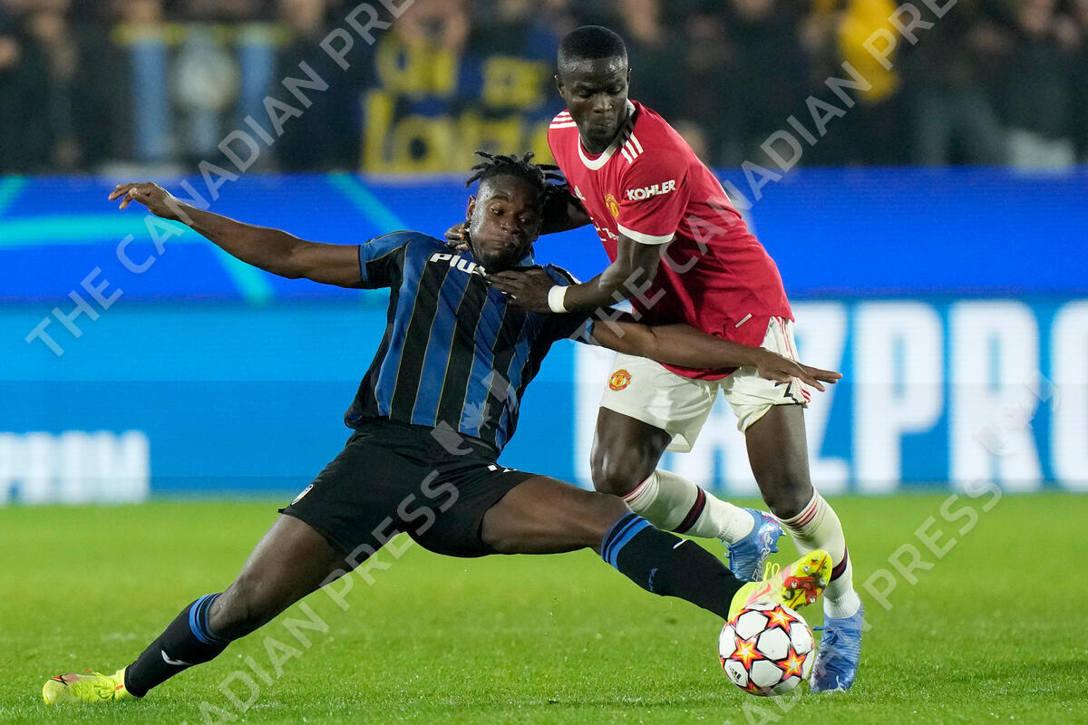 Atalanta's Duvan Zapata fights for the ball with Manchester United's Eric Bailly, right, during the Champions League group F soccer match between Atalanta and Manchester United, at the Stadio di Bergamo, in Bergamo, Italy, Tuesday, Nov. 2, 2021. (AP Photo/Luca Bruno)
