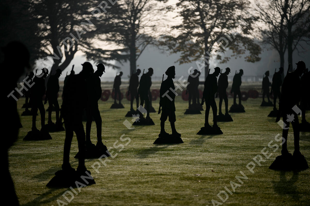 A new outdoor remembrance display, including 25 newly commissioned near-life-sized silhouettes of Indian soldiers from World War I stood alongside 100 British "Tommy" soldiers, displayed at Hampton Court Palace, in south west London, Wednesday, Nov. 3, 2021. The display created as part of the 'Standing with Giants' project is to represent almost 1800 Indian soldiers who sailed to Britain in 1919 to take part in the World War I peace parade in London and were encamped on the grounds of Hampton Court for the duration of their stay. (AP Photo/Matt Dunham)