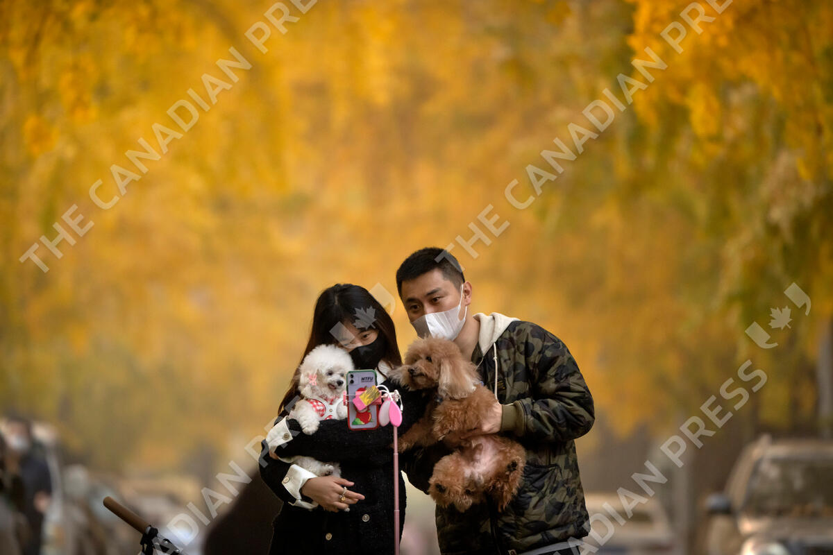 A couple wearing face masks holds their dogs as they pose for a selfie with ginkgo trees whose leaves have turned yellow along a street in the embassy district in Beijing, Thursday, Nov. 4, 2021. (AP Photo/Mark Schiefelbein)