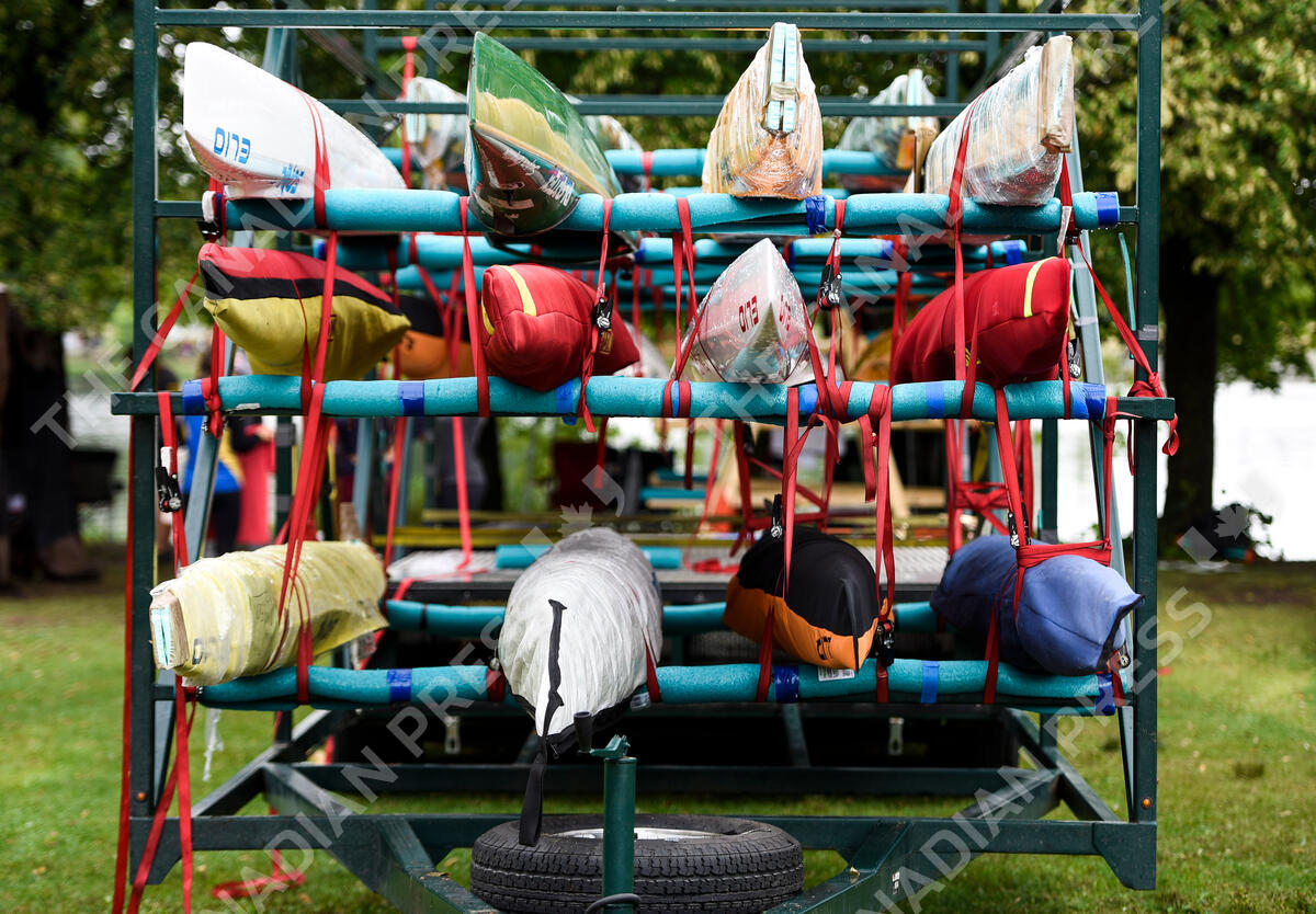 Boats are secured to a trailer on the last day of racing at the Canadian Sprint Canoe and Kayak Championships at Mooney's Bay in Ottawa, on Sunday, Aug. 29, 2021. THE CANADIAN PRESS/Justin Tang
