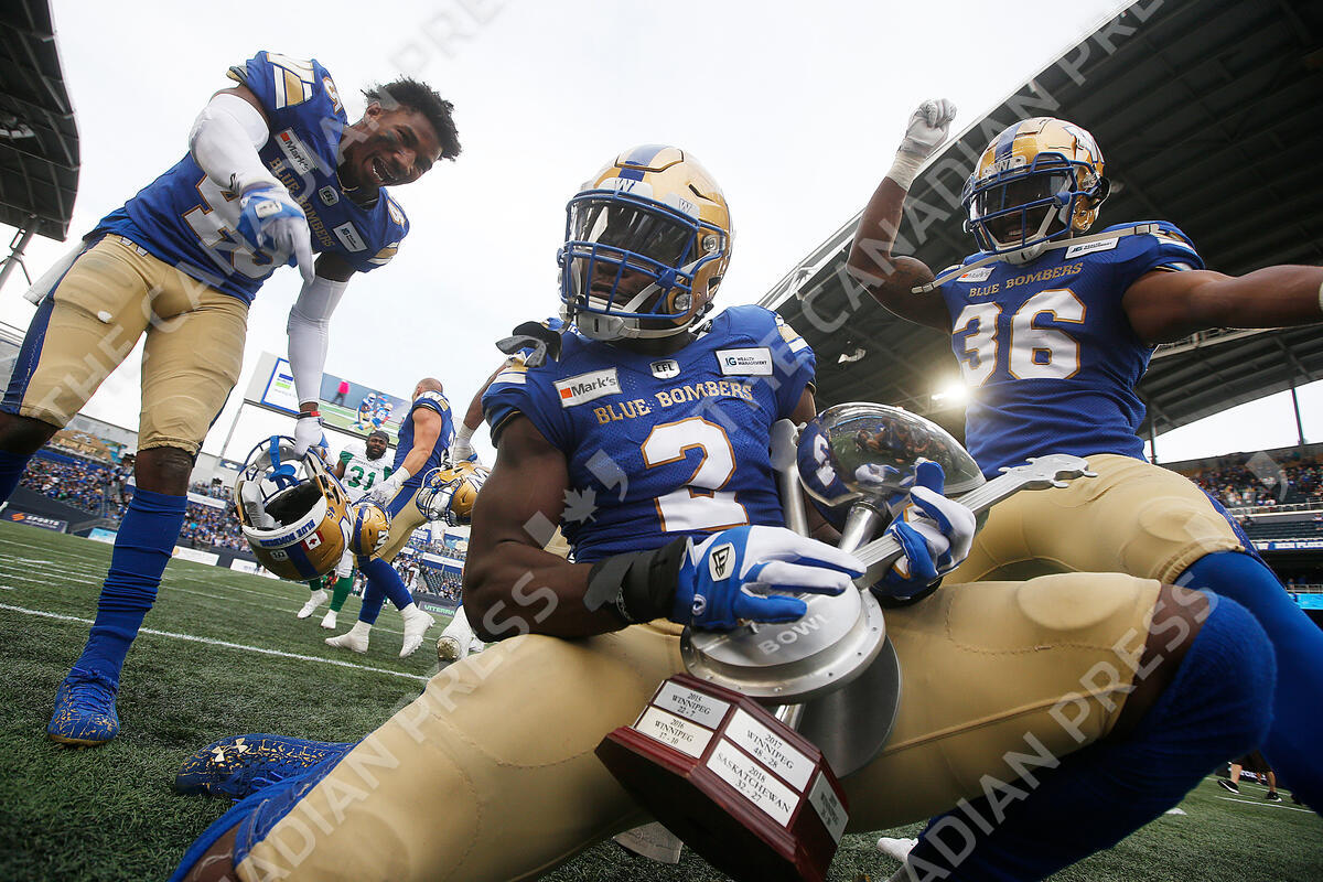 Winnipeg Blue Bombers' DeAundre Alford (45), Jonathan Kongbo (2) and Jontrell Rocquemore (36) celebrate a Banjo Bowl win over the Saskatchewan Roughriders in CFL action in Winnipeg Saturday, September 11, 2021. THE CANADIAN PRESS/John Woods