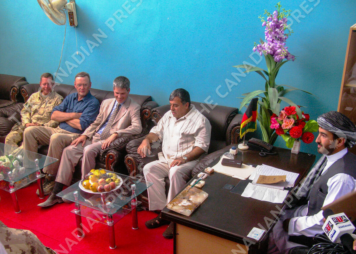 Canadian Brig.-Gen. Jonathan Vance, Canada's representative in Kandahar Ken Lewis, Charge d'Affaires Ben Rowswell, Kandahar Gov. Tooryalai Wesa and Dand district chief Ahamadullah Nazak (from left to right) attend a shura on Tuesday, June 23, 2009 at the district centre in Deh-e Bagh, Afghanistan. The gathering marked the public debut of Canda's "model village" strategy. THE CANADIAN PRESS IMAGES/Colin Perkel