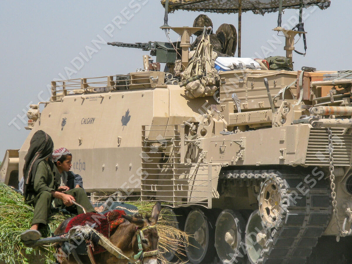 A Canadian T-Lav passes Afghans on a donkey cart in Bazari-Panjwaii, Afghanistan, on Monday, June 29, 2009. THE CANADIAN PRESS IMAGES/Colin Perkel