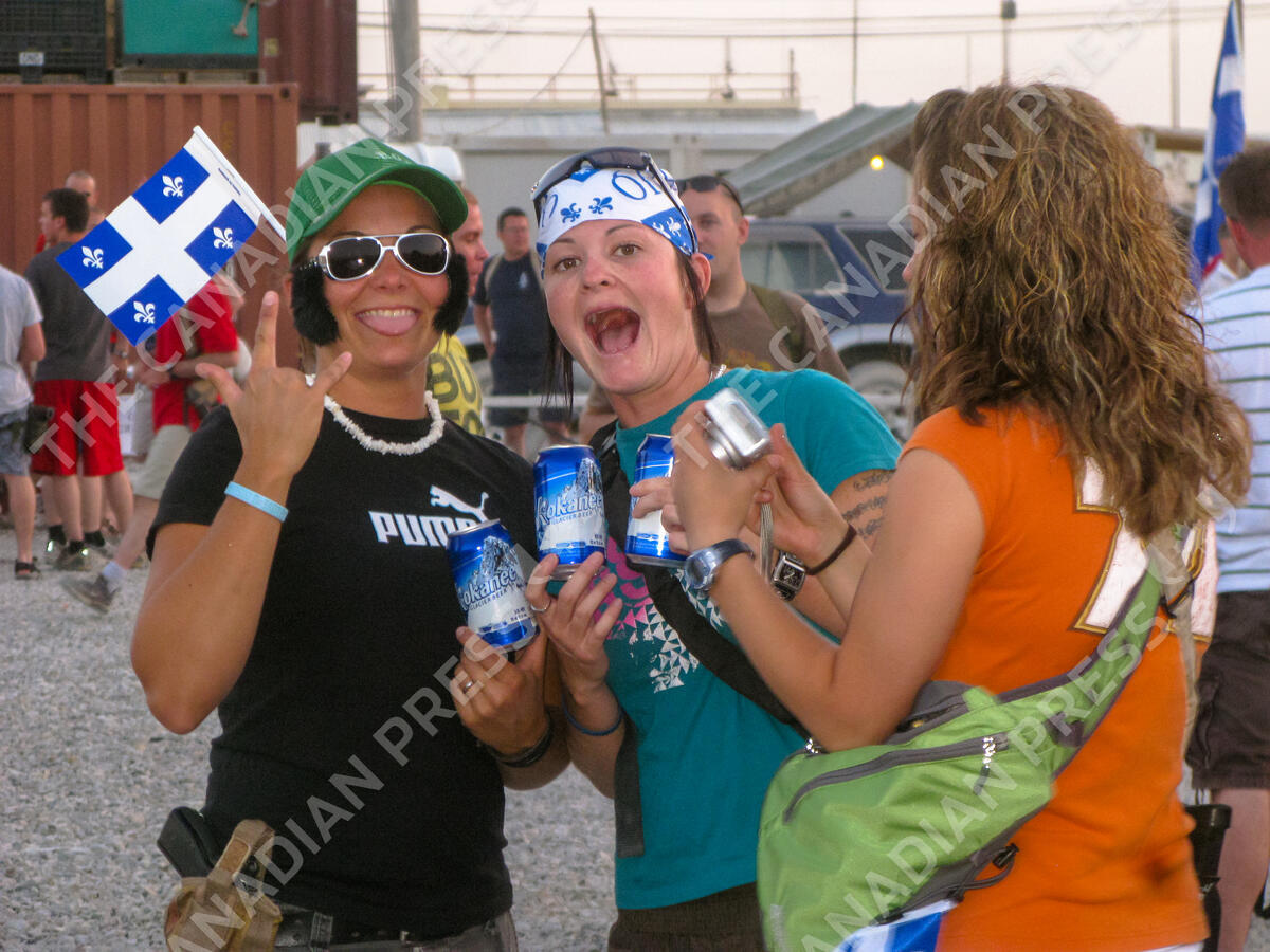 Quebec soldiers celebrate Saint-Jean-Baptiste Day celebration at Kandahar Airfield, Afghanistan, on Wednesday, June 24, 2009. The festival is one of few occasions troops are allowed beer. THE CANADIAN PRESS IMAGES/Colin Perkel