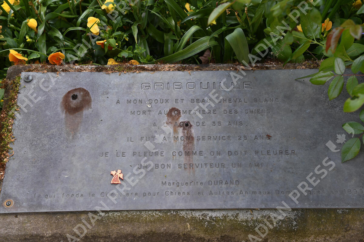 Tomb of Gribouille, the Marguerite Durand's white horse, in the 'Cimetiere des Chiens'in Asnieres-sur-Seine on the outskirts of Paris, France on May 2021.The Parisian 'Cemetery of Dogs and Other Domestic Animals'is said to be the world's oldest public pet cemetery. Le 'Cimetiere des Chiens’ is a long, narrow cemetery with attractively landscaped grounds that overlook the Seine. The neatly laid-out rows of graves include tombstones and other monuments from the late 19th Century to the present day, many with statues or photos of beloved pets. The cemetery owes its beginnings to a law that was passed in 1898, when the Paris city government declared that dead pets couldn't just be tossed out with the trash or dumped in the Seine, but had to be buried in hygienic graves at least 100 meters from the nearest dwelling. Attorney Georges Harmois and journalist Marguerite Durand quickly conceived the idea of a 'cemetery for dogs and other domestic animals'. In June, 1899, digging began on a narrow parcel of riverfront land in Asnieres-sur-Seine. The new cemetery opened for business that summer, and over the years more than 40 000 animals have been buried in the Cimetière des Chiens, not just dogs, but also cats, a racehorse, a lion, a monkey, and domestic animals such as rabbits, hamsters, mice, birds, and fish. The markers are full of sentiment and epitaths from times gone by to fill one's heart to overflowing. The most famous graves of the cemetery are: the grave of Film star Rin Tin Tin; the grave of Moustache, the mascot of the Napoleon's Grande Armée; the graves of two World War 1 trench dogs and the monument to Barry the famous mountain rescue dog. Photo by Eric Vandeville/ABACAPRESS.COM