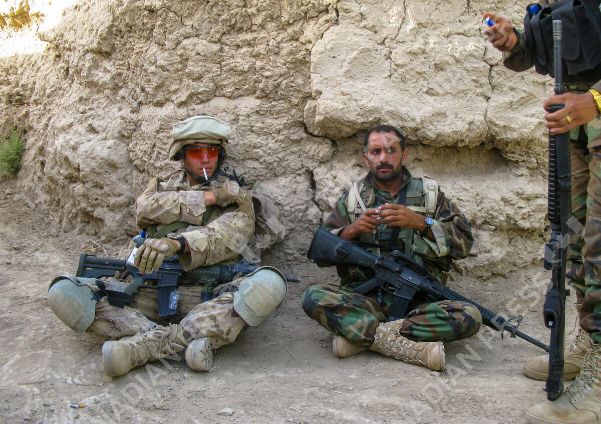 A Canadian soldier enjoys a smoke break with an Afghan National Army counterpart in Salavat, Afghanistan,during an operation on Thursday, June 18, 2009. The soldiers were on a two-day hunt for insurgents and their weapons. THE CANADIAN PRESS IMAGES/Colin Perkel