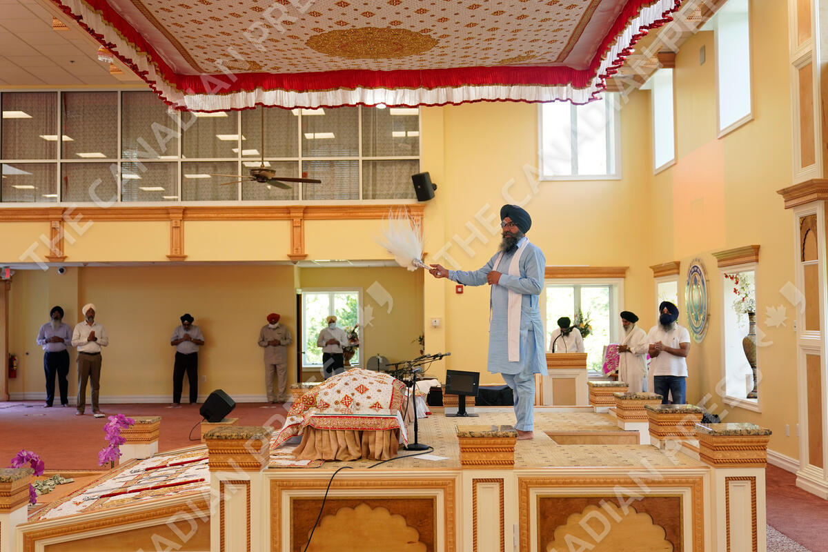 Raghuvinder Singh, center, participates in a Sikh worship service at a gurdwara in Glen Rock, N.J., Sunday, Aug. 15, 2021. Baba Punjab Singh, a Sikh priest visiting from India, was shot in the head by a white supremacist Army veteran in Wisconsin in 2012, and left partially paralyzed. He died from his wounds in 2020. Over seven years, the priest’s son, Raghuvinder Singh, split his time between caring for his father in Oak Creek and working in Glen Rock, New Jersey, as assistant priest at a gurdwara there. Raghuvinder said the greatest lesson his father taught him was how to embody “chardi kala,” which calls for steadfast optimism in the face of oppression. (AP Photo/Seth Wenig)