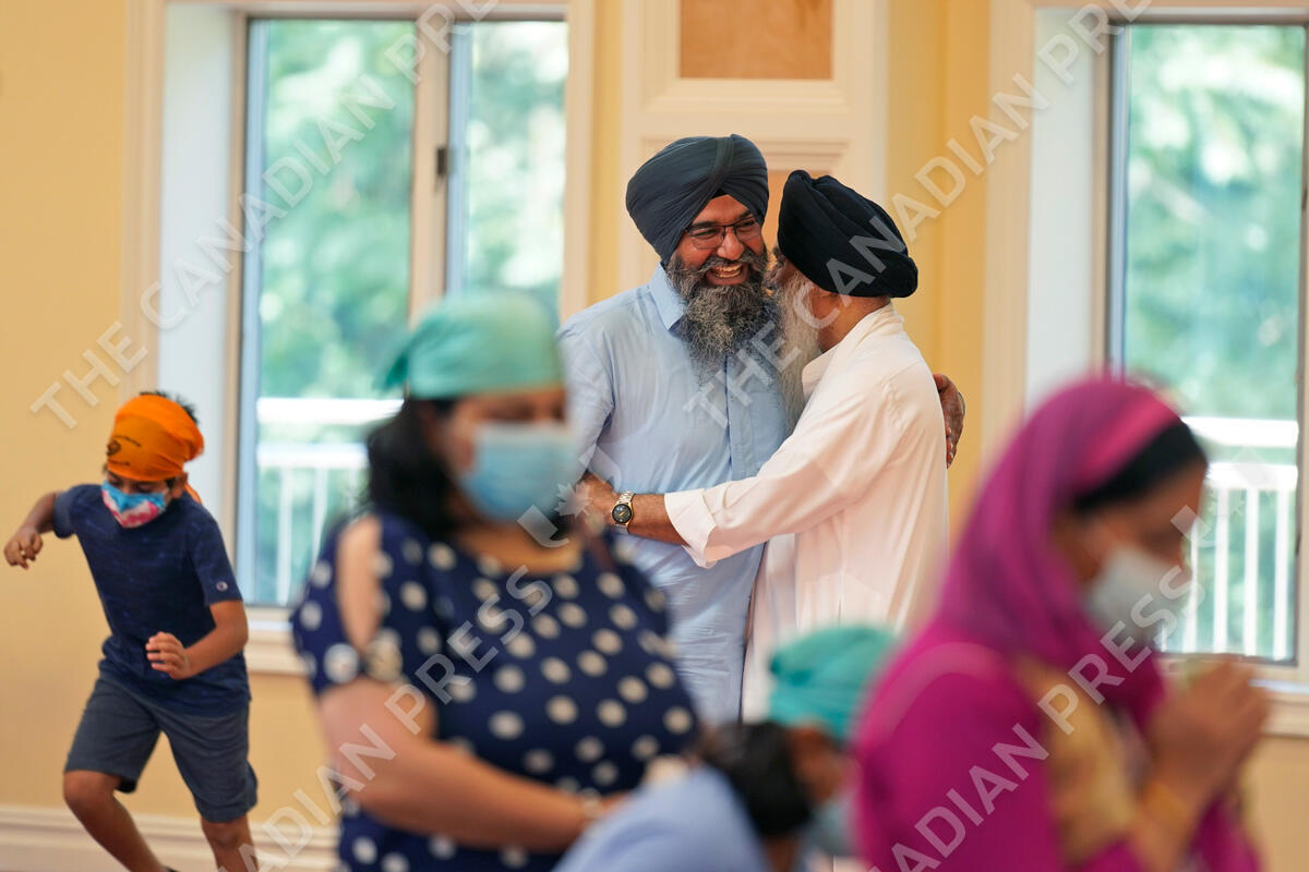 Raghuvinder Singh, center left, greets a friend after a Sikh worship service at a gurdwara in Glen Rock, N.J., Sunday, Aug. 15, 2021. Baba Punjab Singh, a Sikh priest visiting from India, was shot in the head by a white supremacist Army veteran in Wisconsin in 2012, and left partially paralyzed. He died from his wounds in 2020. Over seven years, the priest’s son, Raghuvinder Singh, split his time between caring for his father in Oak Creek and working in Glen Rock, New Jersey, as assistant priest at a gurdwara there. Raghuvinder said the greatest lesson his father taught him was how to embody “chardi kala,” which calls for steadfast optimism in the face of oppression. (AP Photo/Seth Wenig)