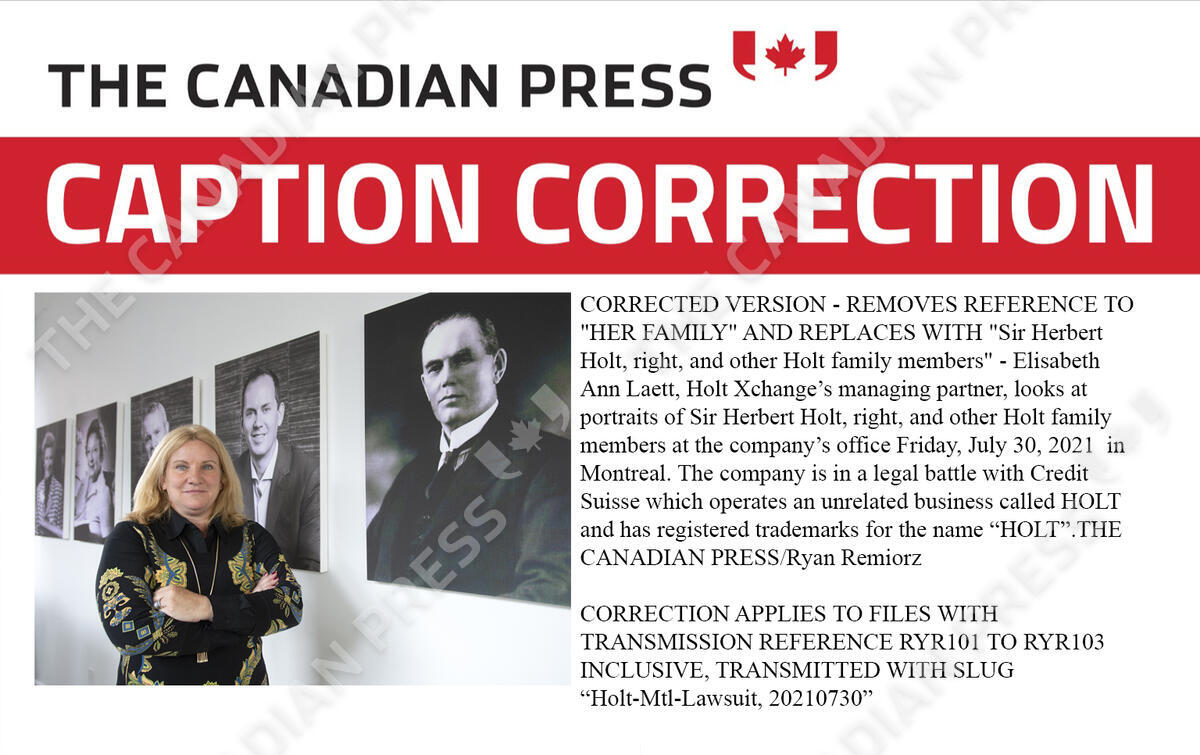 Elisabeth Ann Laett, Holt Xchange’s managing partner, is seen in front of portraits Sir Herbert Holt, right, and other Holt family members at the company’s office Friday, July 30, 2021 in Montreal. The company is in a legal battle with Credit Suisse which operates an unrelated business called HOLT and has registered trademarks for the name “HOLT”.THE CANADIAN PRESS/Ryan Remiorz