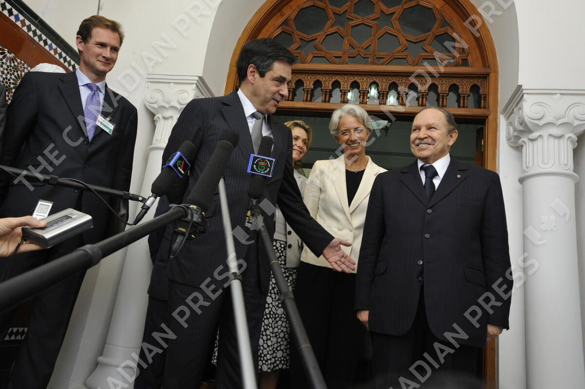 French Prime Minister Francois Fillon, Algerian President Abdelaziz Bouteflika, Minister for Higher Education and Research Valerie Pecresse and French Minister for the Economy, Industry and Employment Christine Lagarde after a meeting at El Mouradia Palace in Algiers, Algeria on June 22, 2008. Photo by Elodie Gregoire/ABACAPRESS.COM