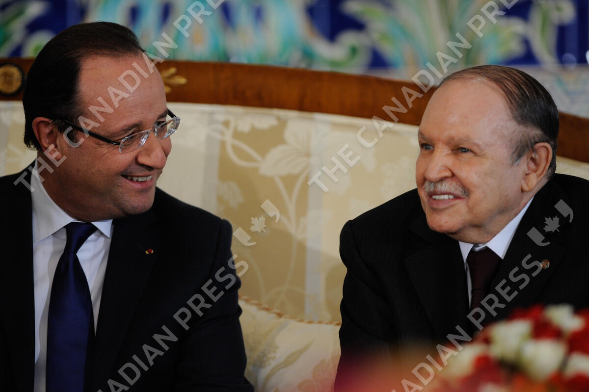 French President Francois Hollande and Algerian President Abdelaziz Bouteflika attend a ceremony at the Houari Boumedienne Airport in Algiers, on a first day of a two days state visit in Algeria, on December 19, 2012. Photo by Christophe Guibbaud/ABACAPRESS.COM
