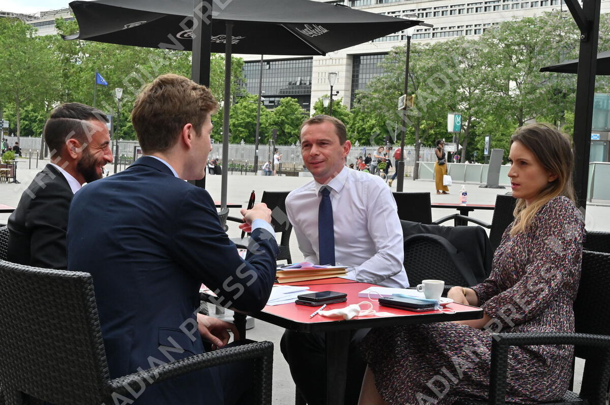 Junior Minister of Public Action and Accounts Olivier Dussopt holds a meeting with his team, Chief of Staff Christophe Linxe, deputy Chief of Staff Elsa Michonneau and Media Advisor Benjamin Rosmini, outside the Economy Ministry on June 7, 2021 in Paris, France. Photo by Elodie Gregoire/ABACAPRESS.COM