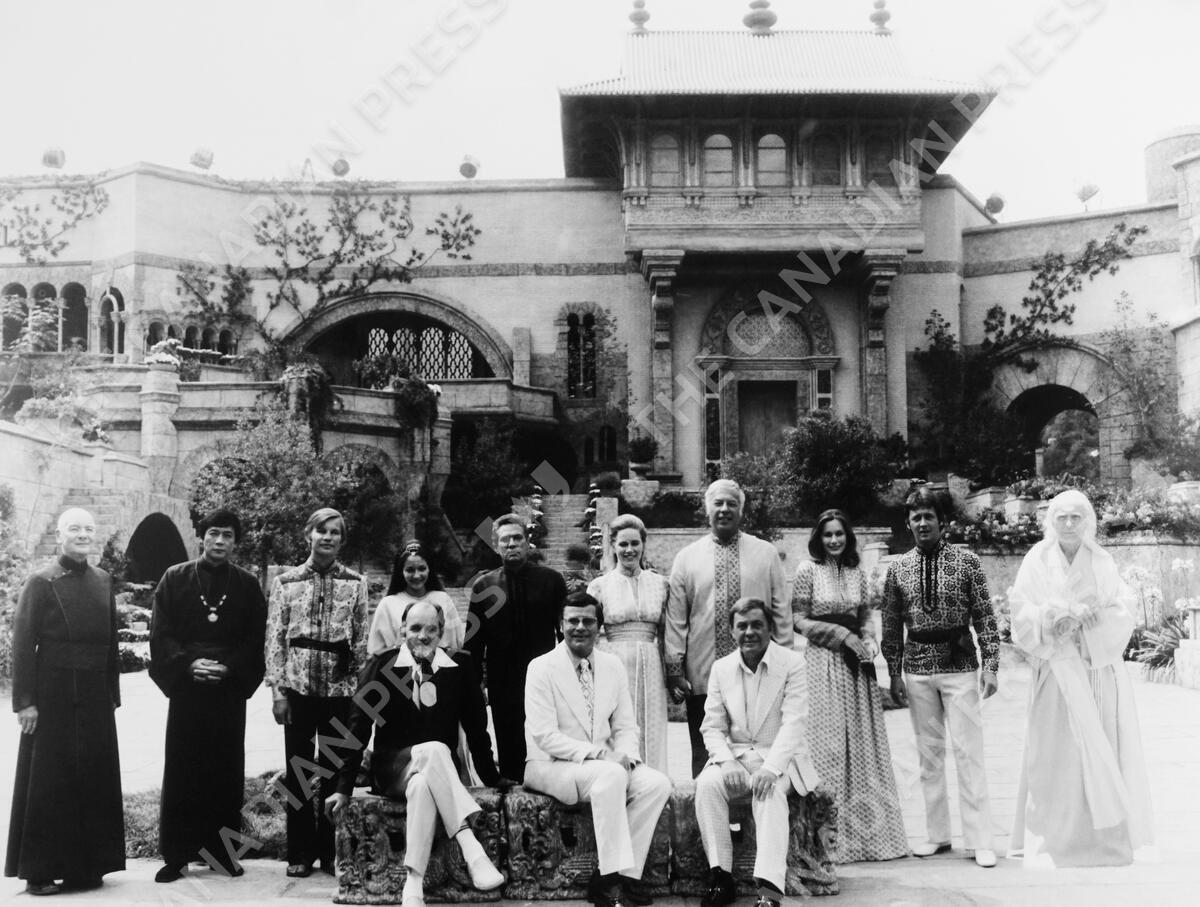 LOST HORIZON, front from left: director Charles Jarrott, producer Ross Hunter, producer Jacques Mapes with the cast, 1973
