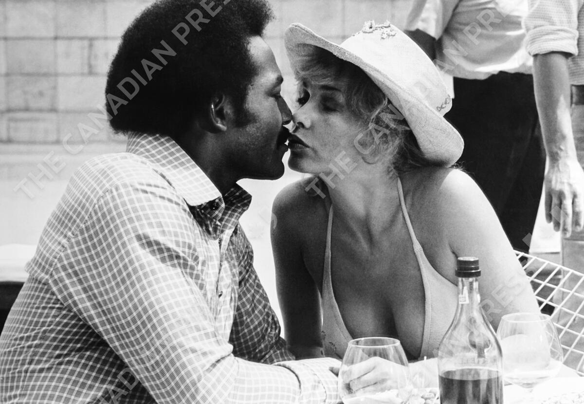 SLAUGHTER, from left: Jim Brown, Stella Stevens on set, 1972