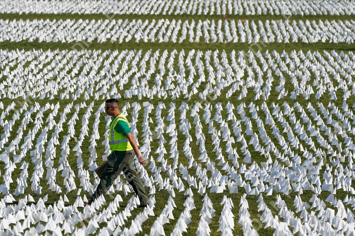 A worker walks past white flags that were planted as part of artist Suzanne Brennan Firstenberg's temporary art installation, "In America: Remember," in remembrance of Americans who have died of COVID-19, on the National Mall in Washington, Wednesday, Sept. 15, 2021. The installation will consist of more than 630,000 flags when completed. (AP Photo/Patrick Semansky)
