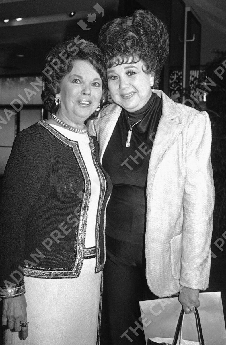 FILE - In this May 20, 1985 file photo, former child actress Shirley Temple Black, left, is greeted by actress Jane Withers during a special tribute to Black presented by the Academy of Motion Pictures Arts and Sciences and the Academy Foundation in Beverly Hills. Withers, the former child actor who bedeviled Temple on the screen and went on to star in a series of B movies that made her a box-office champion, died Saturday, Aug. 7, 2021. She was 95. (AP Photo/Nick Ut, File)