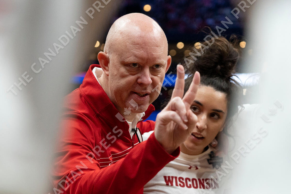 FILE - Wisconsin head coach Kelly Sheffield, center, speaks to his team during the championship match of the NCAA women's college volleyball tournament against Nebraska on Saturday, Dec. 18, 2021, in Columbus, Ohio. In 2021, Sheffield coached Wisconsin to its first national championship. (AP Photo/Jeff Dean, File)