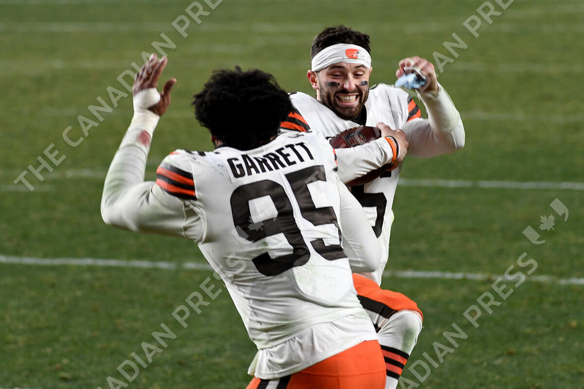 FILE - Cleveland Browns quarterback Baker Mayfield (6) celebrates with defensive end Myles Garrett (95) after defeating the Pittsburgh Steelers 48-37 during an NFL wild-card playoff football game, Sunday, Jan. 10, 2021, in Pittsburgh. The hype surrounding the Browns' upcoming reunion with Mayfield has already begun and figures to build. Garrett plans to treat it like any other game.(AP Photo/Justin Berl, File)